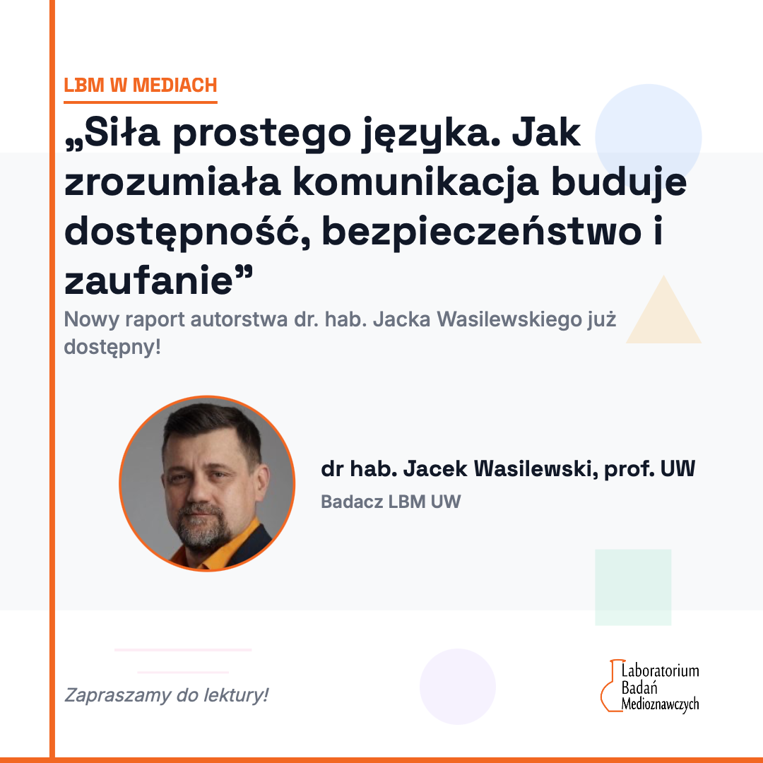 Polecamy nowy artykuł „Siła prostego języka. Jak zrozumiała komunikacja buduje dostępność, bezpieczeństwo i zaufanie”, opartego na sondażu przeprowadzonego przez dr. hab. Jacka Wasilewskiego. Badanie powstało na zlecenie PKO Banku Polskiego, a wnioski z niego są już dostępne na stronie banku.