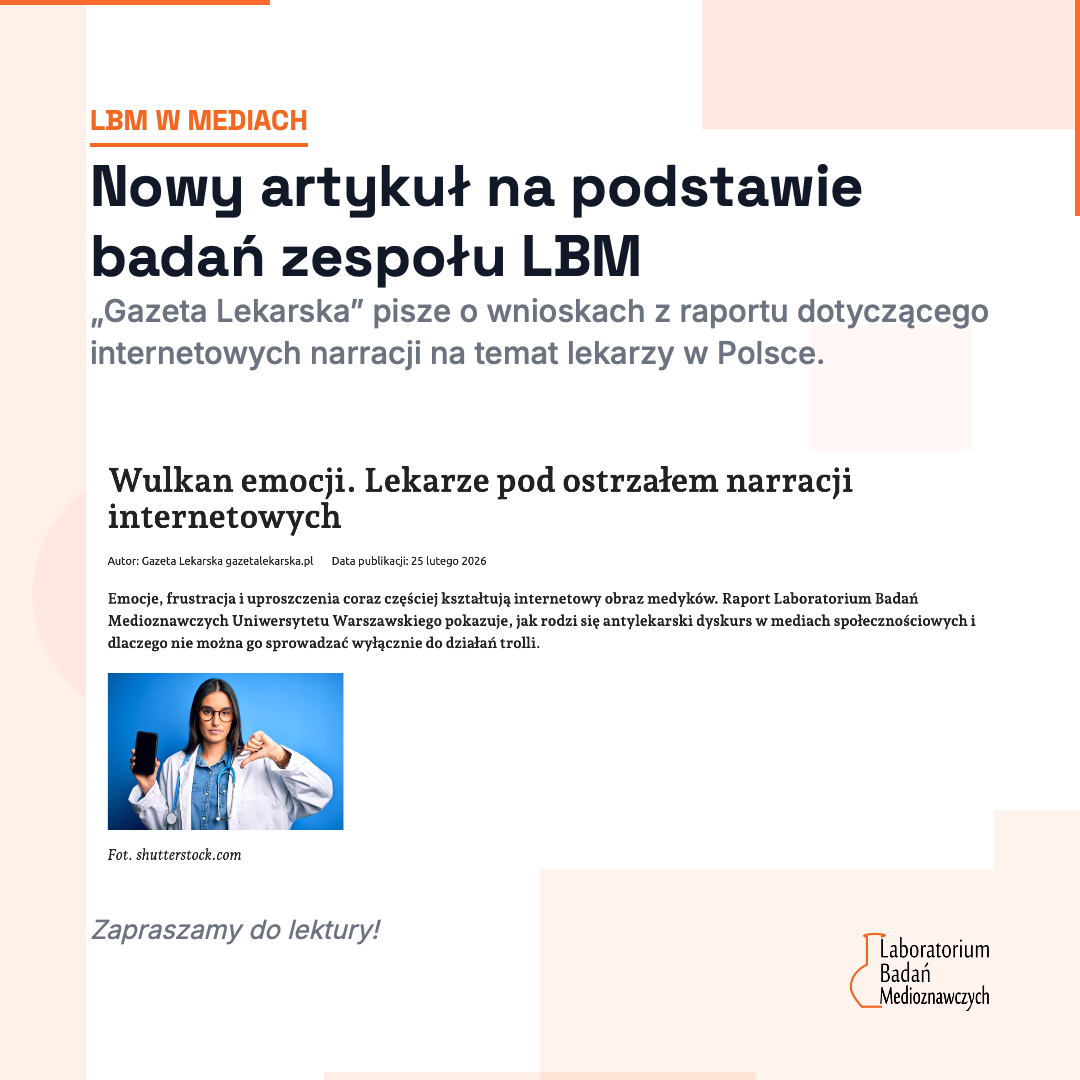 Zapraszamy do lektury artykułu „Wulkan emocji. Lekarze pod ostrzałem narracji internetowych” poświęconemu badaniu zespółu LBM, dotyczącego internetowych narracji na temat lekarzy w Polsce. Analiza powstała na zlecenie Naczelnej Izby Lekarskiej, a jej główne wnioski opisuje „Gazeta Lekarska”.